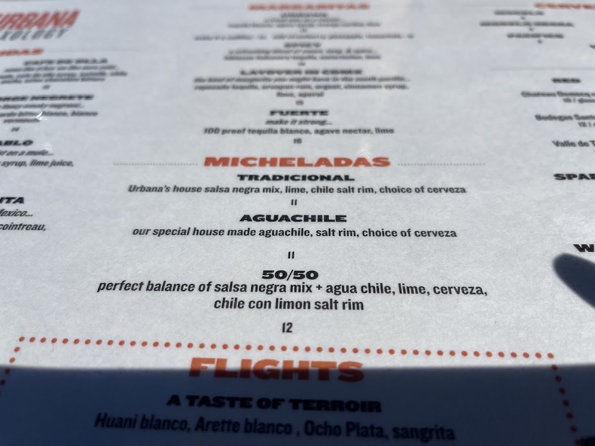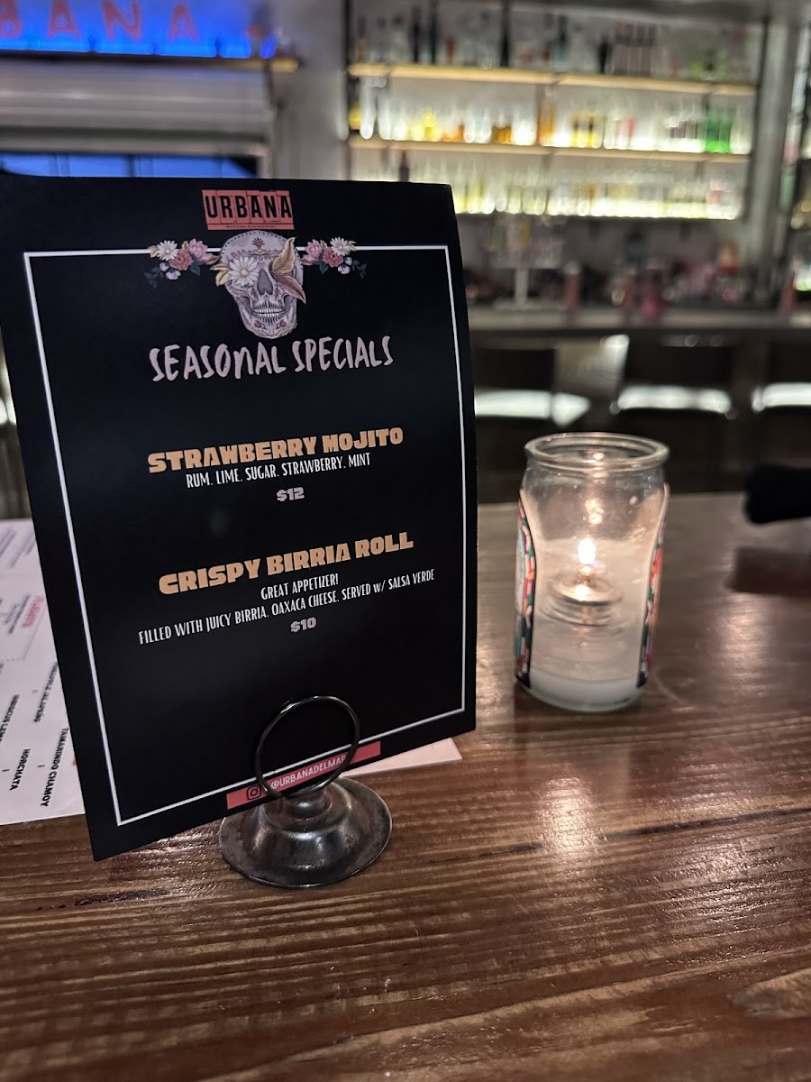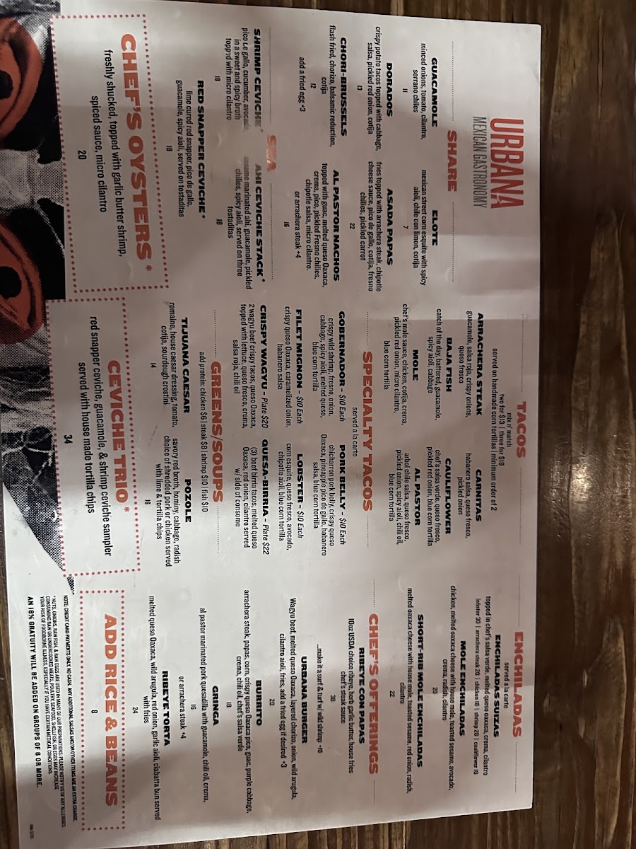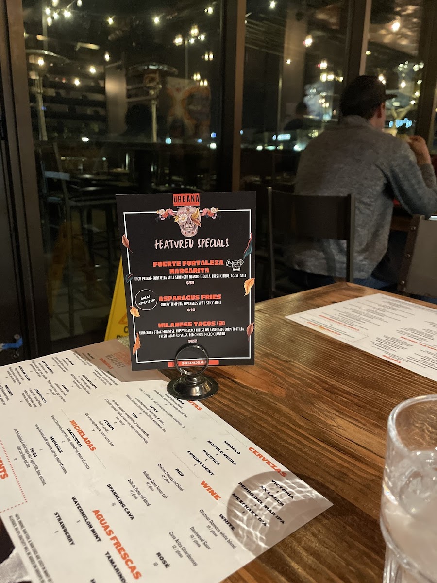 Urbana Mexican Gastronomy & Mixology offers a diverse and flavorful menu that beautifully blends traditional Mexican dishes with innovative touches. For those seeking appetizers, the Elote and Dorados are perfect choices, alongside the mouthwatering Wagyu Sliders and Chori-Brussels. The Asada Papas (Fries) and Tacos provide a wide variety of options such as the rich Carnitas, savory Chicken Mole, and the fresh Baja Fish. For a heartier meal, the Ribeye Con Papas and Steak Burrito from the Chef’s Offerings are standout dishes, while the Ribeye Torta and Urbana Burger provide a unique twist on familiar favorites. The Enchiladas selection includes options like Lobster Enchiladas and Short-Rib Mole Enchiladas, offering something for every taste. For taco enthusiasts, the Specialty Tacos section shines with options like Pork Belly, Quesa-Birria Tacos, and Crispy Wagyu Tacos, while Shrimp Ceviche from the Sea menu offers a refreshing bite. To complement your meal, the Pozole and Tijuana Caesar in the Greens & Soups section are excellent choices. For sides, you can’t go wrong with Crema, Beans & Rice, and an array of salsas. The drink menu features classics like Sprite, Coke, and Diet Coke in cans. With its rich offerings and creative dishes, Urbana is an exceptional spot for anyone craving vibrant Mexican flavors in a contemporary setting.