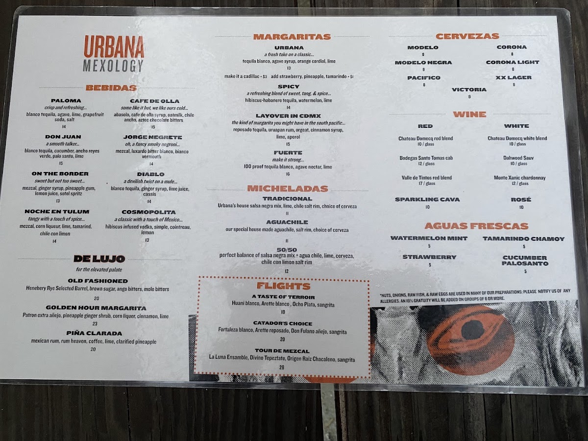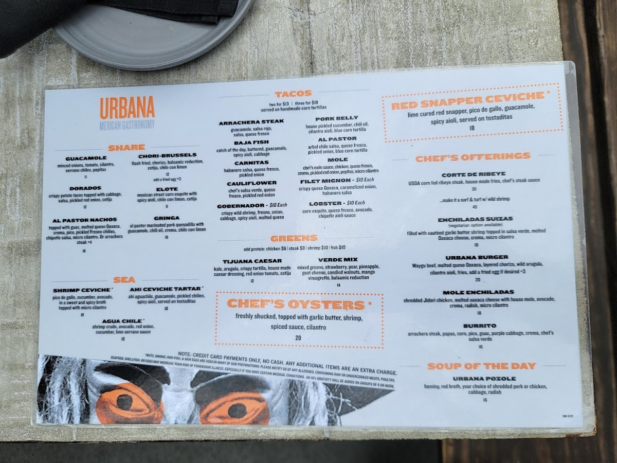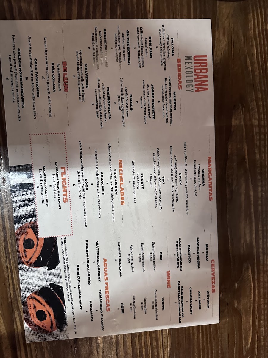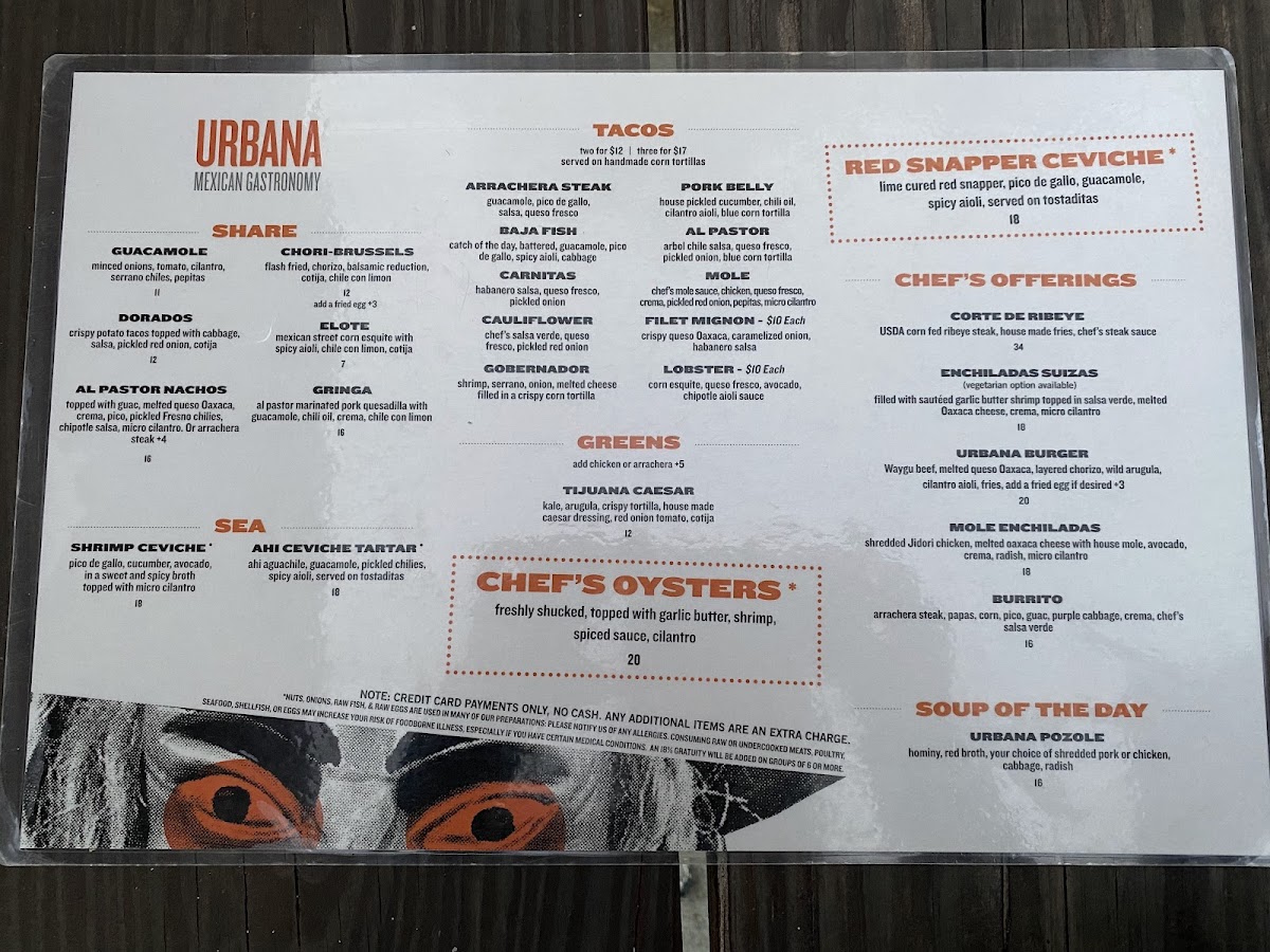 Urbana Mexican Gastronomy & Mixology offers a diverse and flavorful menu that beautifully blends traditional Mexican dishes with innovative touches. For those seeking appetizers, the Elote and Dorados are perfect choices, alongside the mouthwatering Wagyu Sliders and Chori-Brussels. The Asada Papas (Fries) and Tacos provide a wide variety of options such as the rich Carnitas, savory Chicken Mole, and the fresh Baja Fish. For a heartier meal, the Ribeye Con Papas and Steak Burrito from the Chef’s Offerings are standout dishes, while the Ribeye Torta and Urbana Burger provide a unique twist on familiar favorites. The Enchiladas selection includes options like Lobster Enchiladas and Short-Rib Mole Enchiladas, offering something for every taste. For taco enthusiasts, the Specialty Tacos section shines with options like Pork Belly, Quesa-Birria Tacos, and Crispy Wagyu Tacos, while Shrimp Ceviche from the Sea menu offers a refreshing bite. To complement your meal, the Pozole and Tijuana Caesar in the Greens & Soups section are excellent choices. For sides, you can’t go wrong with Crema, Beans & Rice, and an array of salsas. The drink menu features classics like Sprite, Coke, and Diet Coke in cans. With its rich offerings and creative dishes, Urbana is an exceptional spot for anyone craving vibrant Mexican flavors in a contemporary setting.
